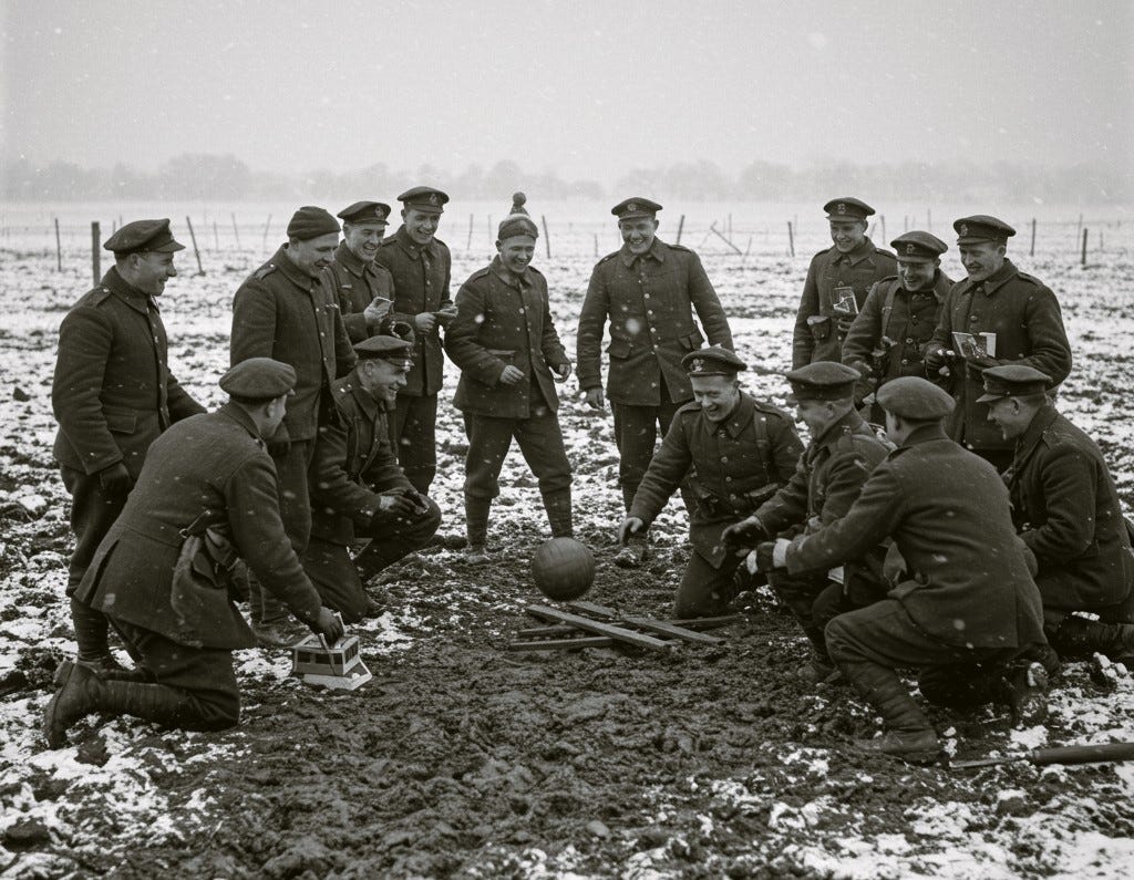 De undeva a apărut o minge, probabil un bun al unui soldat britanic. N-a fost o partidă de fotbal formală, ci una la care fiecare ostaș era bine primit, întrunind probabil sute, neimaicontând cât de mare e terenul, dacă există porți și fără nevoia unui arbitru. Nici măcar dacă știi sau nu să joci fotbal. Nu mai conta nici frigul, nici gheața de pe jos, nici găurile provocate de armamentul detonat. Toți erau bucuroși că pot alerga, fără să se mai teamă pentru viața lor, după aceeași minge! (Cine a câștigat? Pacea!)